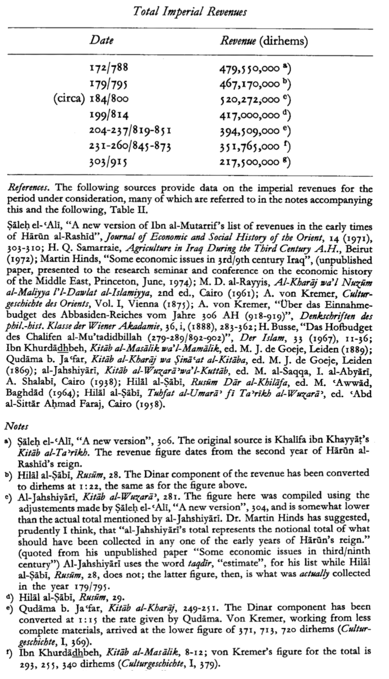 표2: 8~10세기 아랍 제국의 세수 변화. Waines, 1977: 286-87
