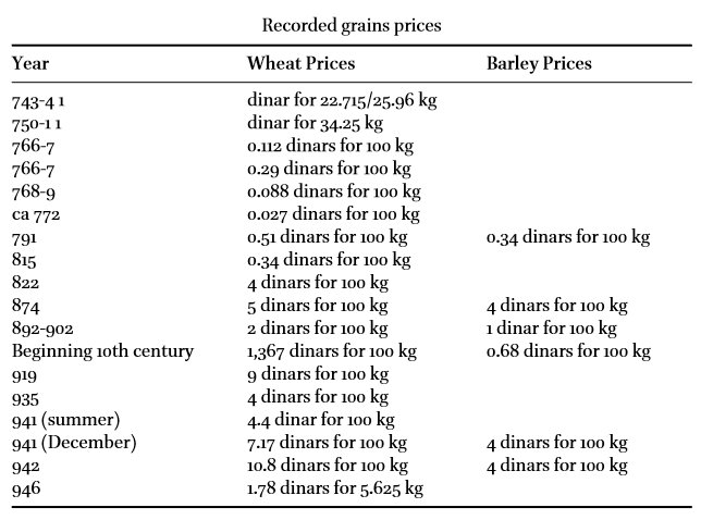 표3: 8~10세기 곡물 가격 변화. Campopiano, 2012: 37